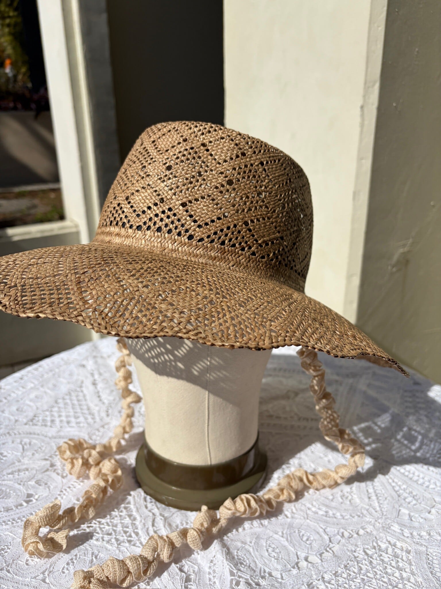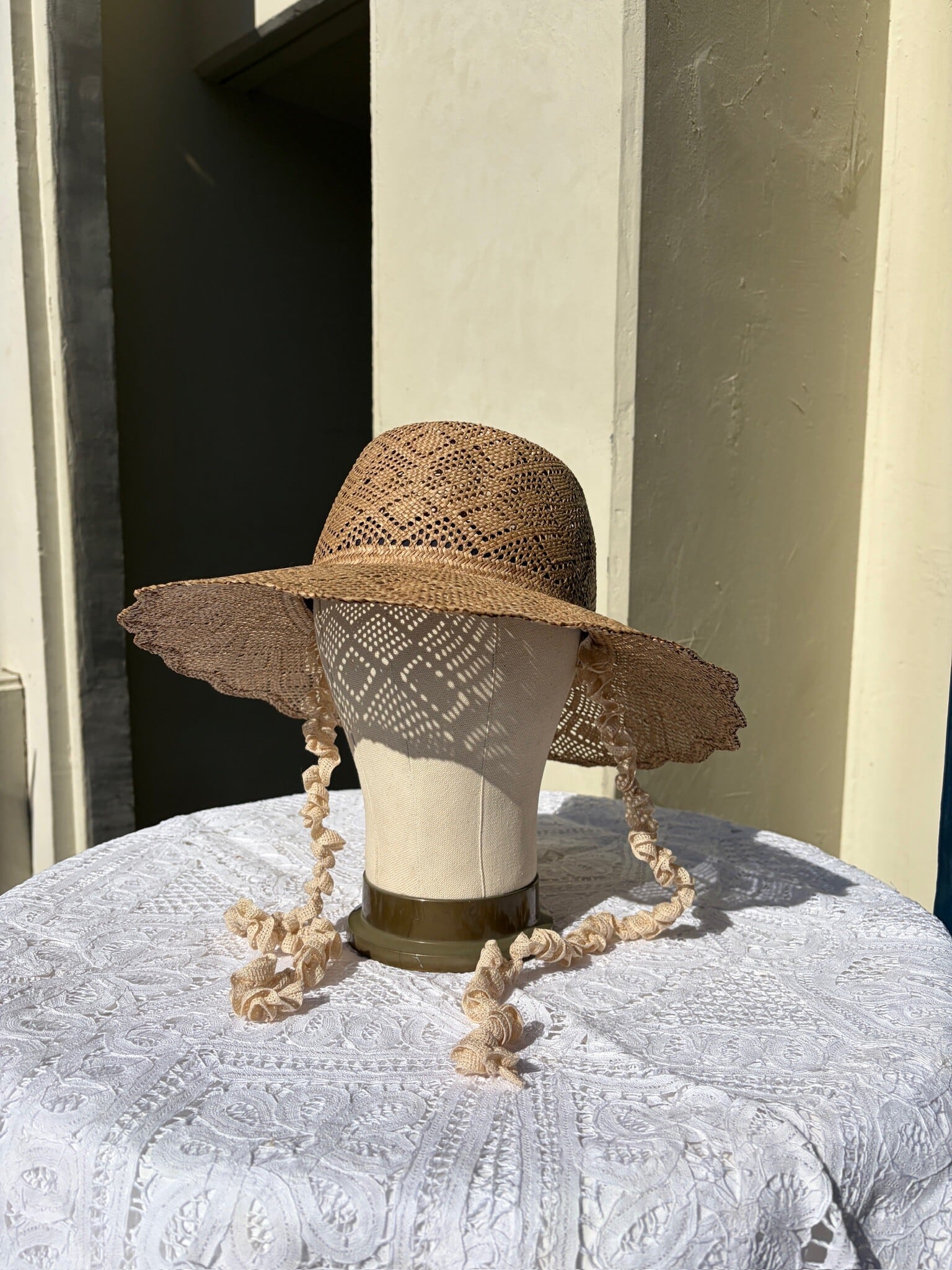 ダイヤレース柄に編み立てられたカンピ草のハット。