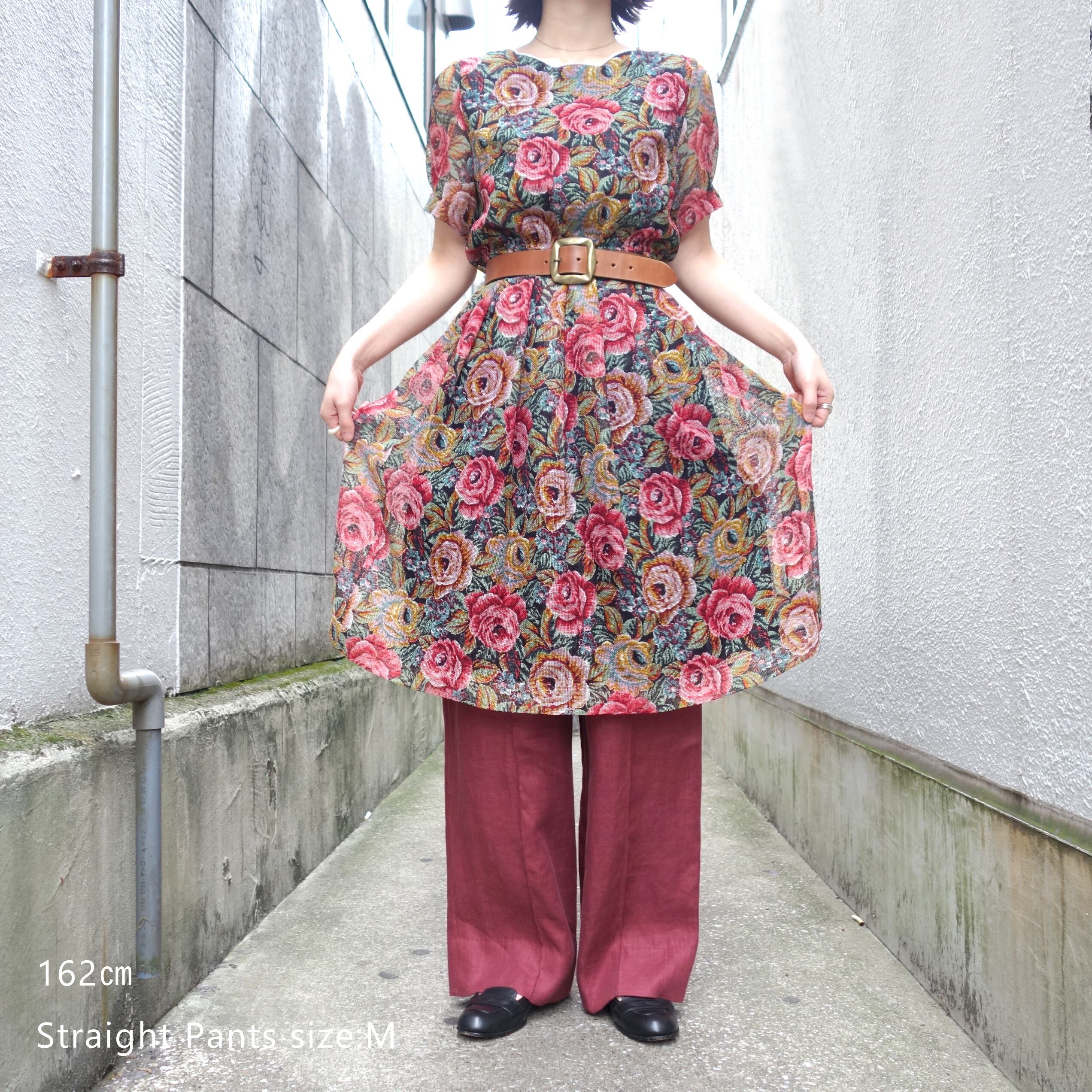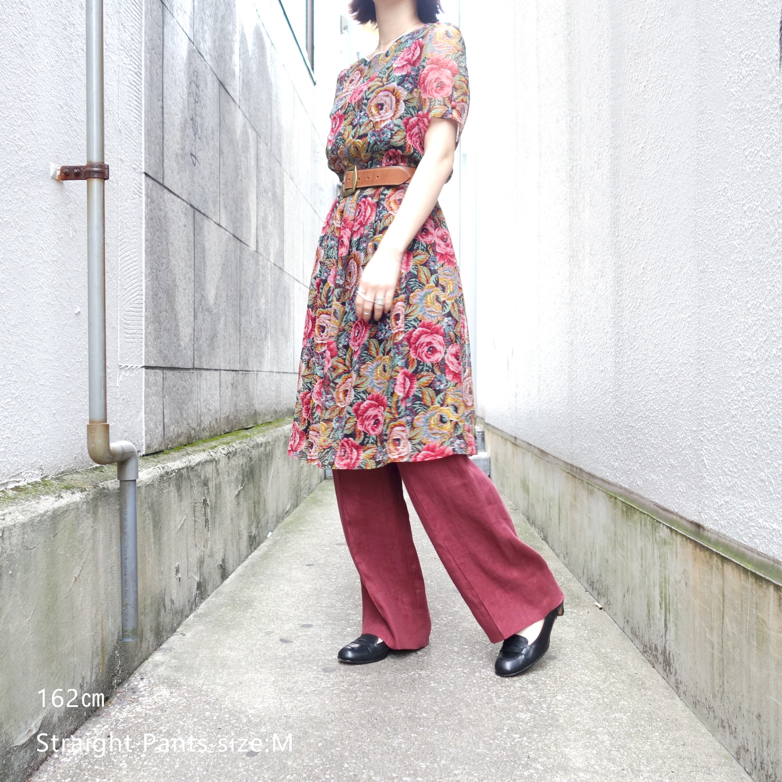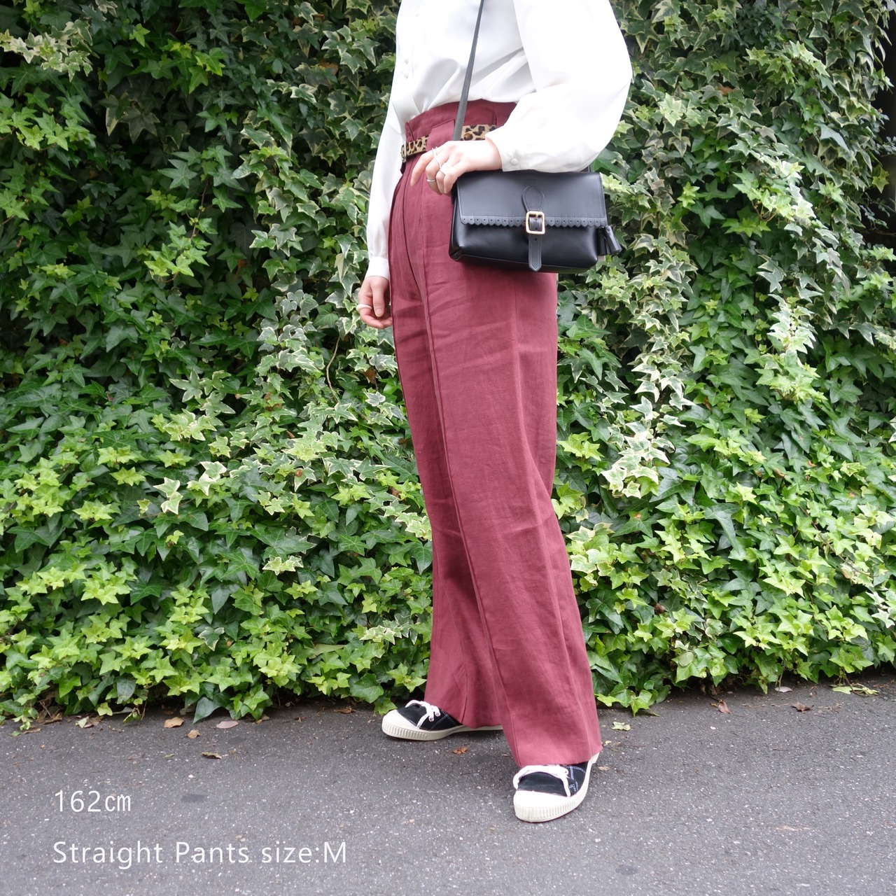 ローズ寄りのくすみがかったワインレッドが落ちついた印象で、意外とどんな色のトップスとも相性がいいと思います。Tシャツと合わせるなら、リップもこのパンツと同じ色で合わせて統一感を、スニーカーでカジュアルさもプラスして。総柄などには、このパンツがコーディネート全体の引き締め役になります。