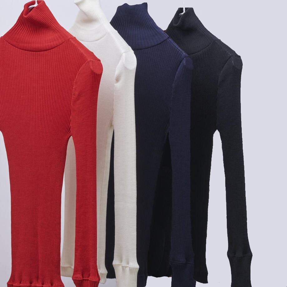 ウールにシルクを混合した上質でソフトな肌触りののリブタートルネックニットソー。